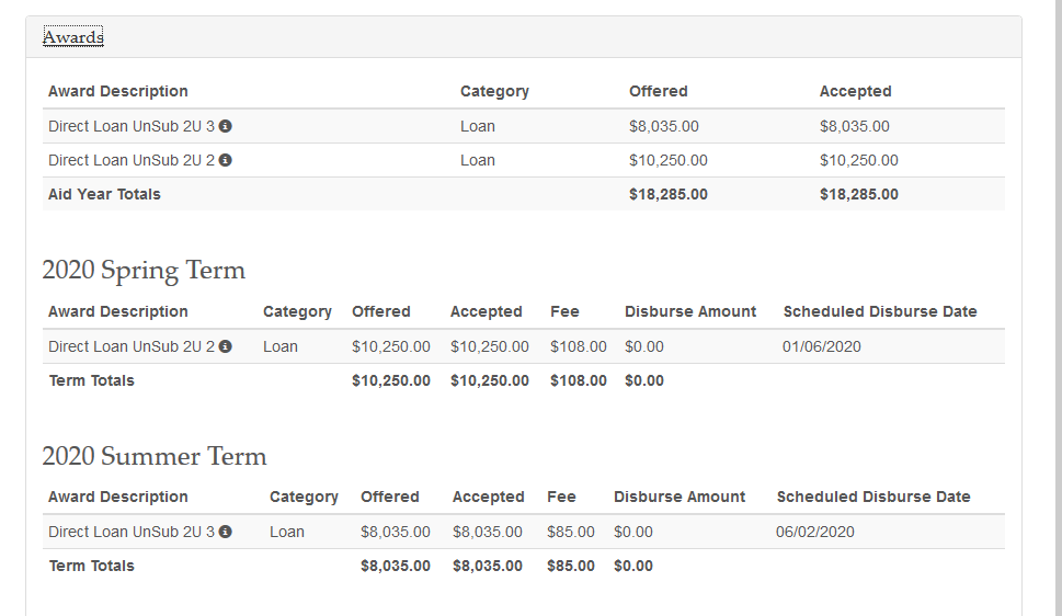 3. Then click “Awards”, which will provide a breakdown of the student’s financial aid package by the year and then by term.